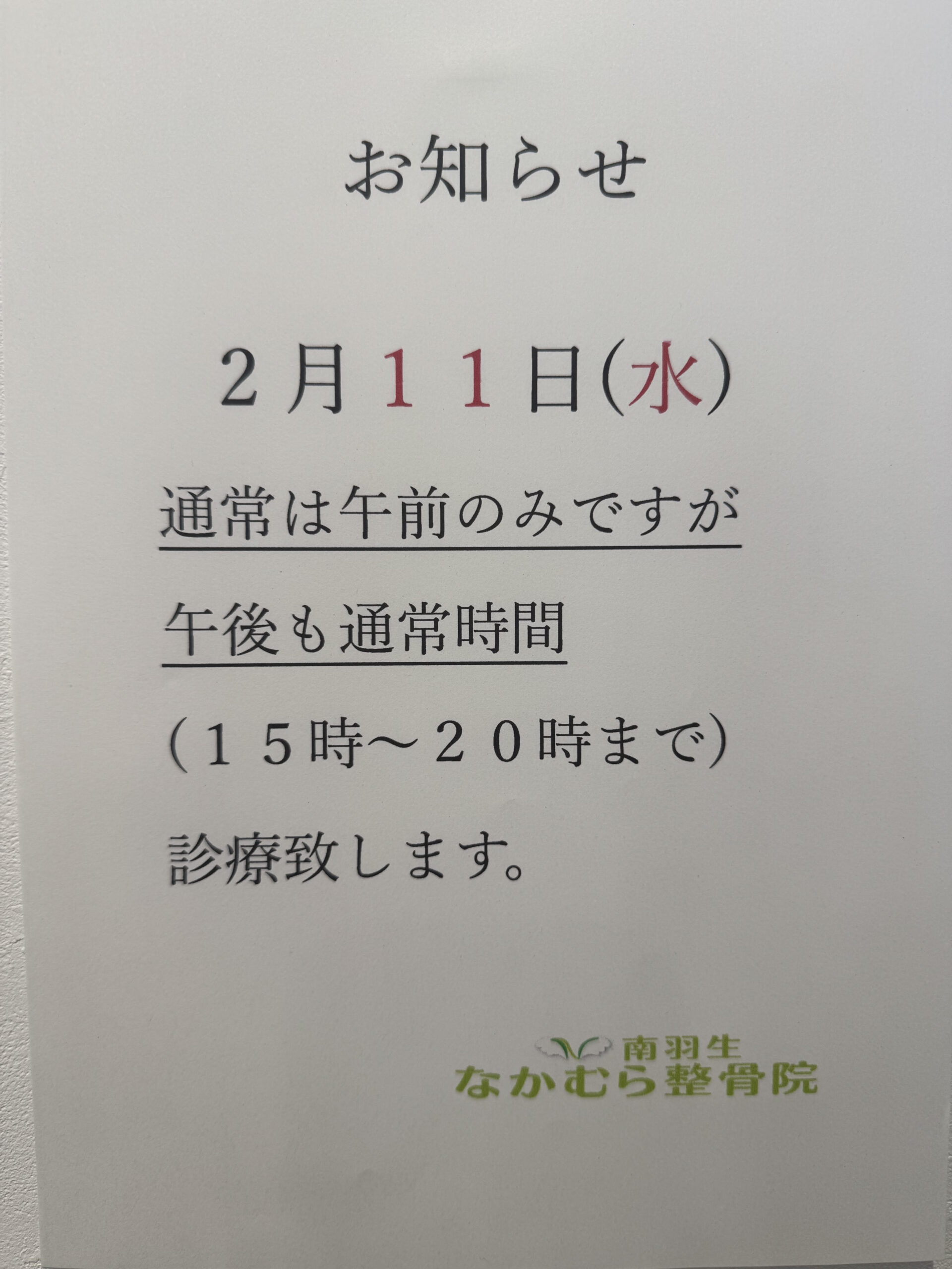 今週の水曜日(2月11日)の建国記念の日ですが通常祝日ですと午前中のみ