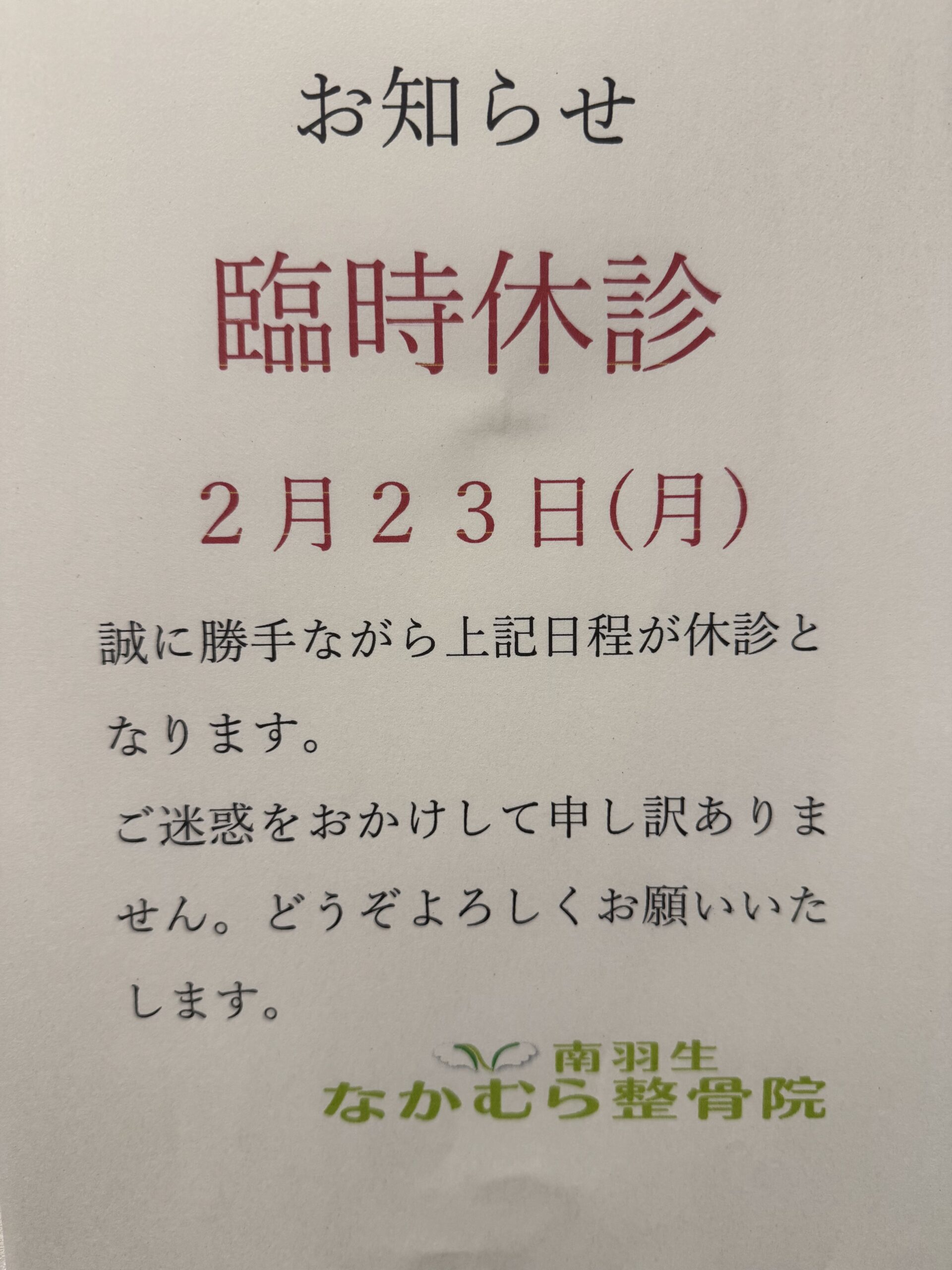 今週末2月23日(月)天皇誕生日は臨時休診となります。